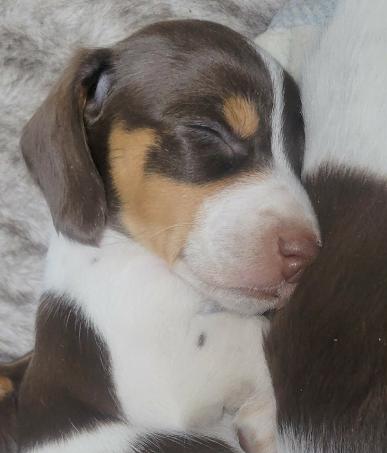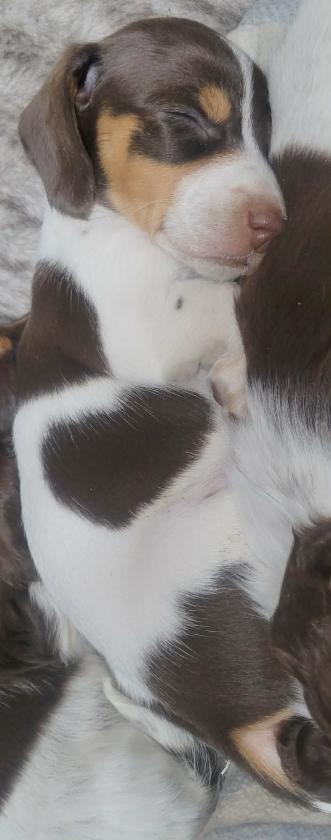 One Shorthair Choc Piebald Male. (The pups can be brought to Roxies Doxies to be picked up, if closer to North-Central Indiana).